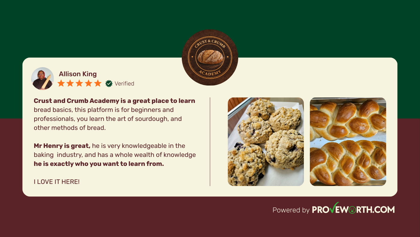 The Academy operates on these same principles:No gatekeeping. If you want to learn, you belong.Trust the process. Bread takes time, skill takes time.Community over competition. We're here to help each other improve.Show up and bake. Learning happens by doing.Why It's Free (And Why That Matters)The part that surprised me most: the Crust & Crumb Academy is completely free.Henry could easily charge $97/month for this level of access and structured learning. Other bread educators charge hundreds for courses with less content and zero community interaction. Henry's mission is to make bread baking accessible to everyone, full stop.It's a smart strategy too. By removing the financial barrier, Henry attracts people who actually want to learn. The result is a higher-quality community where members show up because they want to be there.As member Lindsey Christian put it: "I was in complete SHOCK on how this community is free" given the level of value.The Broader VisionThe Academy extends beyond bread techniques. Henry co-founded the Benevolent Bakers Initiative with Chef Dave Palmer, encouraging bakers to give away homemade bread and serve their communities. The initiative has expanded to three countries.That's what a values-first community produces. People learn more and build real relationships along the way.Why This Approach WorksI've built communities with hundreds of thousands of members, and I can tell you that most online communities fail for the same reasons. They prioritize growth over culture and confuse engagement with value. Or worse, they let everyone in rather than curate their community.Henry has done the opposite. He's built a small, engaged community where members actually improve. He's made it free so the right people join for the right reasons.The result? The #1 rated bread community on the entire Skool platform with perfect reviews from every single member.The Bottom LineIf you want to learn bread baking from YouTube videos and scattered blog posts, you can do that. You'll eventually figure some things out through trial and error.If you want to actually understand bread (the science behind fermentation, how to read your dough, how to troubleshoot problems, how to adapt recipes to your kitchen), you need structured learning with real feedback from experienced bakers.That's what Crust & Crumb Academy delivers. Actual education that changes how you bake.It's free, the teaching is top-notch, and everyone there wants you to get better. While most bread influencers sell dreams, Henry delivers results.Ready to actually learn bread baking?Check out Henry's profile on ProveWorth and then join his community!https://pvwth.com/bakingYour future loaves will thank you.