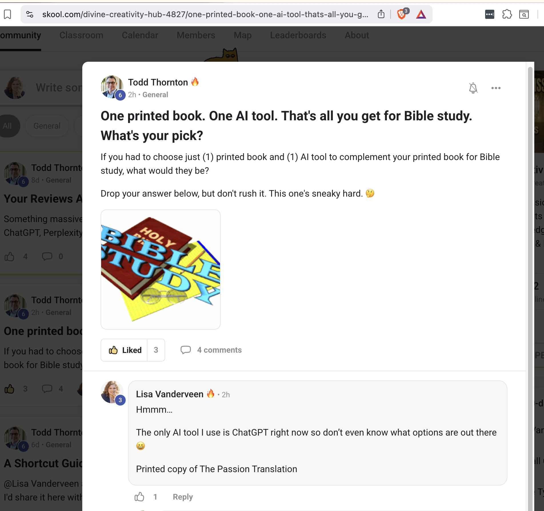 Todd has created a fabulous community with super helpful guidance for AI use as we move into a new digital world. His leadership around how to use AI ethically as a Christian leader has been confirming and incredibly helpful when specific questions...