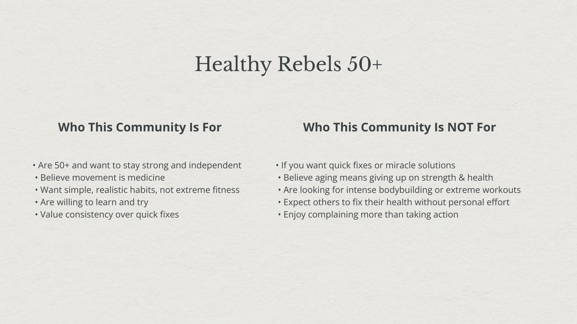 HealthyRebels50+ is a free community for adults over 50 who want to stay physically strong and independent. Members focus on building realistic health habits without pressure or promises of quick results. The community doesn't have reviews yet, so you'd be among the early members.