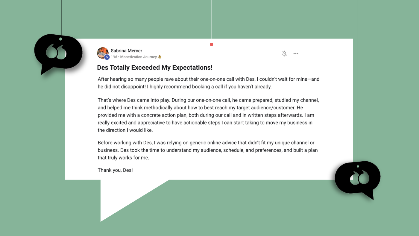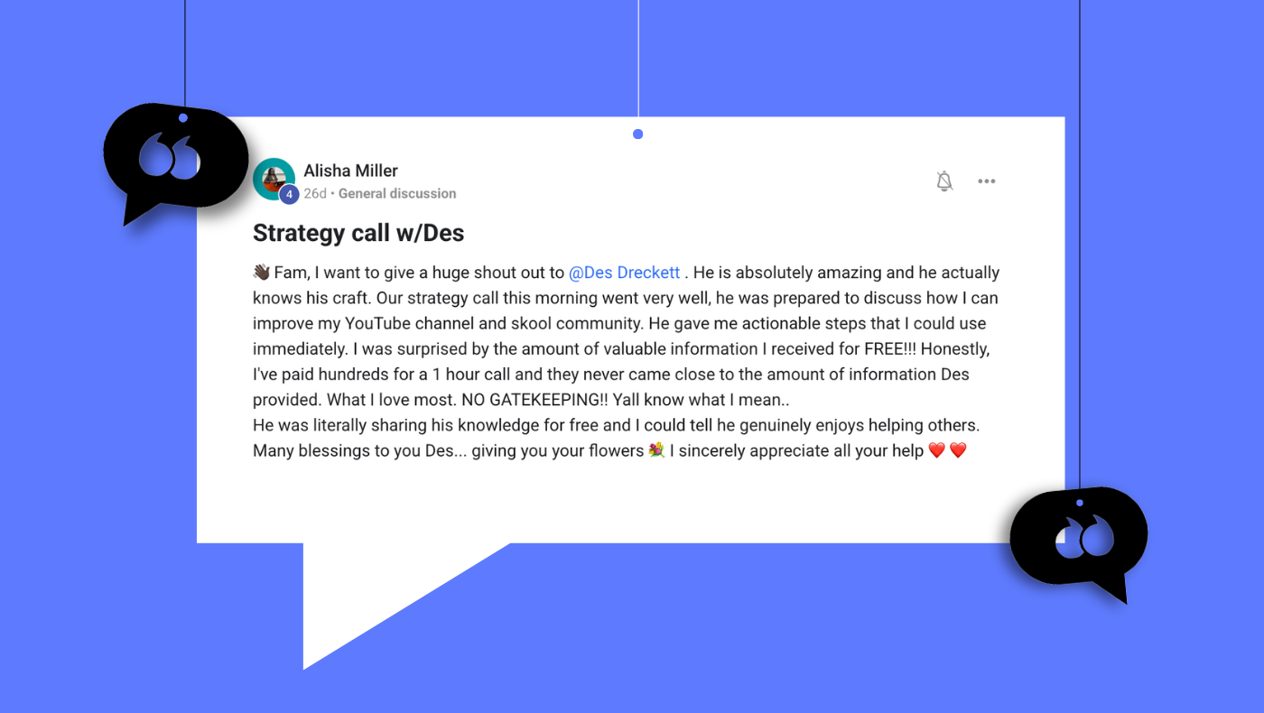 I had a "roadblock" call with Des. It gave me a lot to think about—and I’m in the “I haven’t started yet” camp! Highly recommend a quick call with him and checking out his Skool community. There's much to learn, and it's a friendly environment. 🙌🏻 Thanks again, Des!