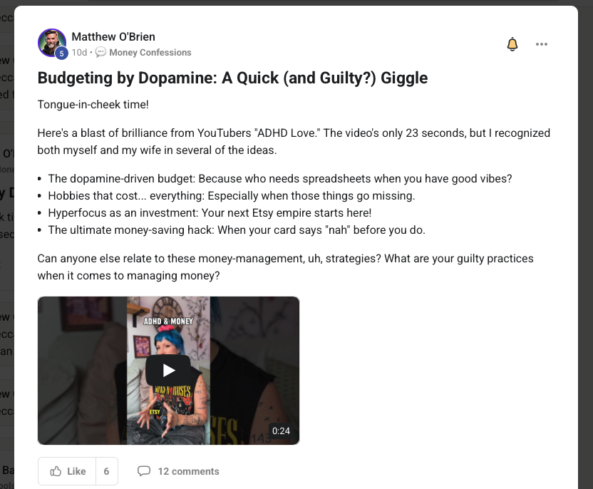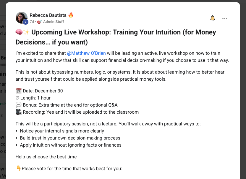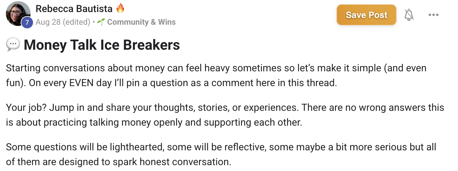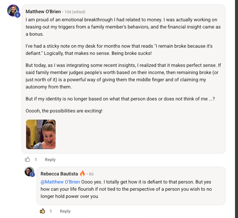 I love Unmuted Money because the leader and community are special, there is nothing like this. A place of support, show up as you are, share your wins and struggles; leave the shame and guilt at the door vibe. And if you can't get past the difficult that is okay too..This is how it feels for me, I can show up confident, or not. I feel seen here. I get to meet people on the calendar event hangouts who are from different parts of the country and world, I get wisdom and reflection/insight listening to others share, it's private and intimate and I always feel better after a call. The community chat is fun, and real. I feel like we could all use this in our lives, and as Rebecca states, Money touches all aspects of our lives. Talking about it leads me to growth and growth leads to less stress. I'm blessed and better off after finding this community and Rebecca.